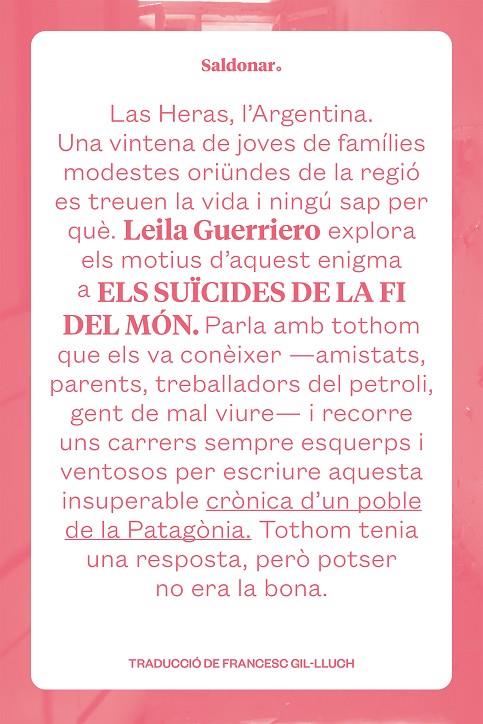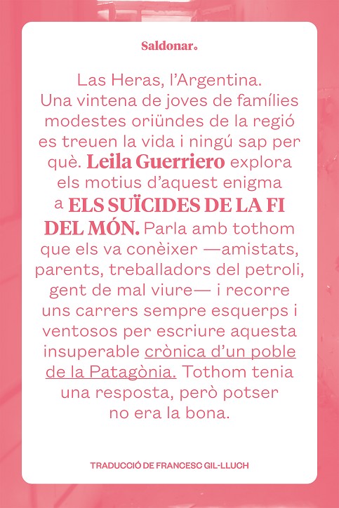 Entre el 1997 i el 1999 una onada de suïcidis sacseja la ciutat petroliera de Las Heras, a la província argentina de Santa Cruz, enmig del no-res. La majoria de les víctimes tenien al voltant de vint-i-cinc anys i havien crescut en famílies modestes de la regió. La periodista Leila Guerriero viatja a aquell indret agrest i salvatge de la Patag.nia, interroga els amics i els familiars dels suïcides, recorre els mateixos carrers que ells, sempre deserts, i visita tots els racons del poble. Entrevista els veïns, fa preguntes a tothom que té una resposta o una teoria que podria explicar un drama tan sorprenent.El resultat de tot plegat és una hist.ria brutal que reconstrueix els episodis tràgics dÆaquells anys i que dibuixa una imatge extrema i inoblidable de la vida quotidiana en una comunitat allunyada de les grans ciutats. Las Heras, amb un alt índex dÆatur pels alts i baixos de la indústria petroliera i per la manca de futur per a la joventut, planteja preguntes difícils de respondre. Els suïcides de la fi del món és un relat inquietant que es pot llegir amb lÆatracció dÆuna novel·la i am